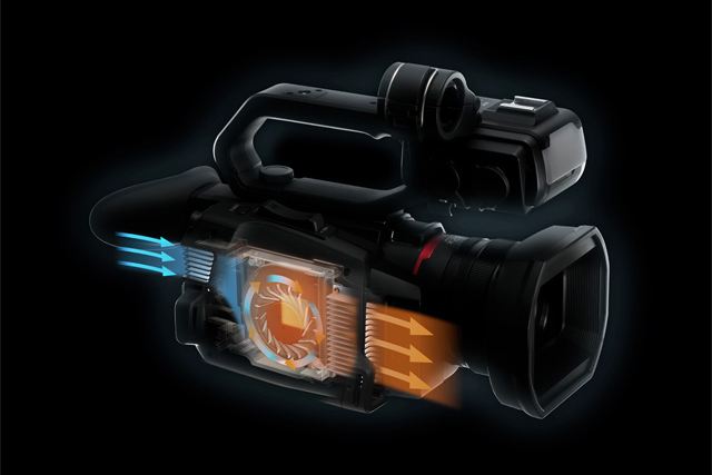 Датчик изображения обычно сильно нагревается при прохождении внешнего света через объектив, и его температура еще больше повышается при высокоскоростной обработке сигнала 4K60, поэтому для поддержания стабильной работы в таких условиях используется усовершенствованная конструкция эффективного теплоотвода.